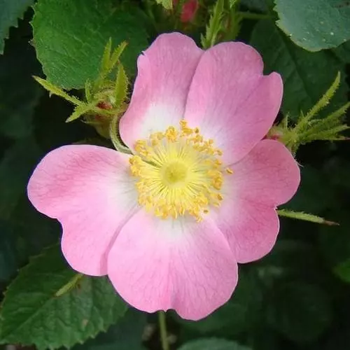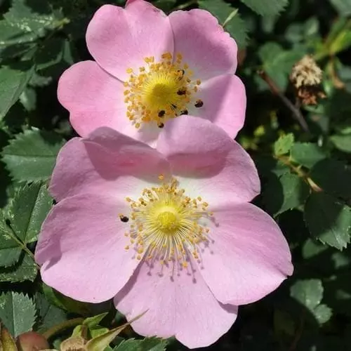 A rare hybrid between the native, wild roses, the dog rose and the burnet rose, Rosa x hibernica is a large, deciduous, shrub rose, with a suckering habit. The mid-green foliage is divided into slightly serrated, ovate leaflets. In midsummer, it bears clusters of lightly scented, deep rose-pink, single blooms with golden stamens; the flowers are attractive to pollinators. The flowers are followed by round, deep red hips in the autumn. The Irish rose would be perfect in a naturalistic planting.