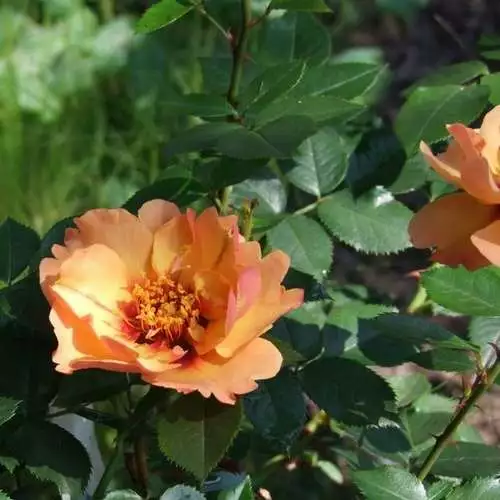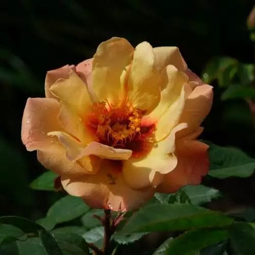 A very pretty, often diminutive, hybrid of Rosa persica with the characteristic persica dark eye, Rosa persica Persian Sun is a small, deciduous, repeat-flowering shrub rose with a compact, dome-shaped habit and glossy, grey-green foliage. From June to October, the plant bears flushes of semi-double, peach-coloured flowers with a deeper eye and golden-yellow stamens; the innermost petals are shorter, giving a very pretty, rather anemone-like effect, and the fragrance is light. Shrub rose Persian Sun is a tough, very healthy rose, and tolerates drought once established. It’s perfect in soil-based compost in a large container, or at the front of a sunny border. Easy to grow and disease-resistant.