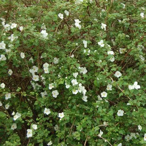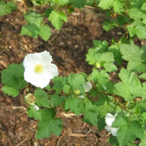A beautiful, hybrid relative of the blackberry, Rubus Benenden is a large, vigorous, almost thornless, deciduous shrub with an upright, arching habit and attractive, light-brown, peeling bark. The mid-green leaves are three- to five-lobed, about 2 ½ – 3”/6-8cm long. In April and May, beautiful, pure white flowers with conspicuous yellow stamens, like dog-roses, 2”/5cm across, are borne all along the stems. Blackberry-like fruits follow in autumn. Good as ground cover in a wild garden, tridel berry Benenden holds the RHS Award of Garden Merit. Can be cut right back in winter.