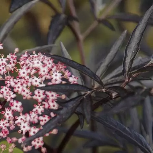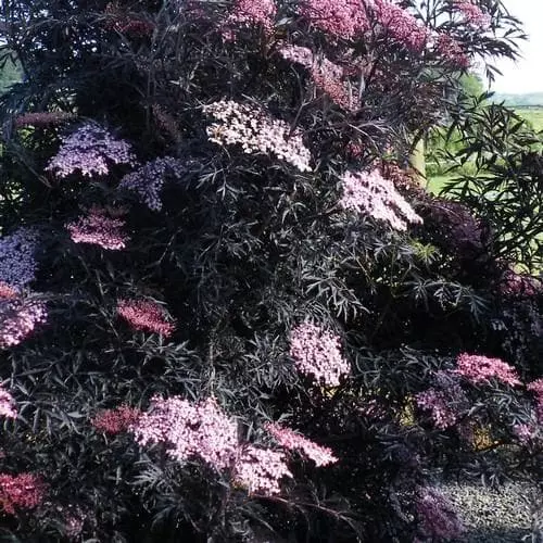 A fast-growing deciduous large shrub or small tree, Sambucus nigra Black Lace has elegant finely-cut leaves of a rich, dark purple-black colour. The flowers produced in May and June are similar to the native Elder, having strongly scented flat heads of tiny creamy-white flowers, but with pink flushes throughout. In Autumn, the foliage turns a rich-red colour. A very good shrub for wildlife when in flower and berry.