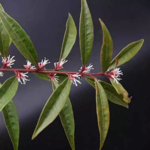 A dwarf variety of the species suitable for the smallest shady garden, Sarcococca hookeriana var. digyna is a small, slow-growing, evergreen shrub with a dense, rounded, suckering habit. The slender, pointed leaves are glossy mid-green, contrasting with the dark, purplish stems. From late winter to early spring, tiny, tassel-like, creamy-white flowers with pinkish-red anthers appear from reddish buds, with a rich vanilla scent, carried on the air. The flowers are followed by small black berries. Plant near a doorway or path to enjoy the lovely scent to the full. Sweet box is a reliable, trouble-free shrub, very attractive to pollinators.