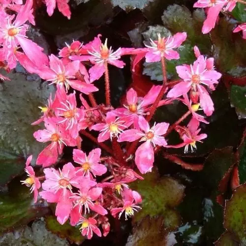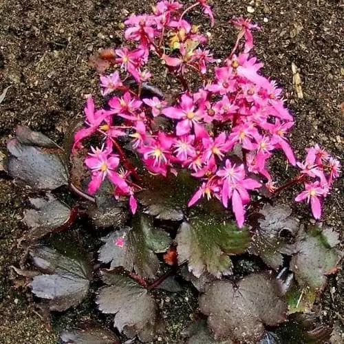 An impressive addition to the late flowering planting scheme, Saxifraga fortunei Black Ruby has deep bronze to almost black foliage, turning reddish in Autumn. The stunning dark pink flowers contrast with the dark leathery leaves in September and October. This is a shade-loving, mat forming perennial that will happily cover banks, inhabit borders or make an underplanting. Good choice for Autumn containers. Avoid frost pockets and good drainage is important.