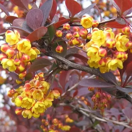 A medium to large sized deciduous shrub with spiny stems and deep reddish purple leaves. Small red-tinged, yellow flowers in late spring followed by red berries in autumn. Good autumn foliage colour, with leaves turning crimson-red. A particularly good and vigorous form.