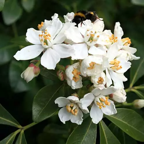A well known, robust shrub, and a cousin of the common citrus tree, Choisya ternata is a rounded evergreen shrub with dense glossy aromatic foliage. Abundant clusters of scented white flowers in Spring with occasional repeat flowering later. It is an excellent choice for urban landscape planting or shrubby borders. Loved by bees.