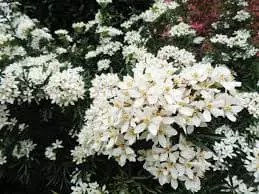 A compact cultivar, said to be an improvement on White Dazzler, Choisya x dewitteana Snow Flurries is a small to medium-sized, fast-growing, evergreen shrub with a rounded habit, ideal for the smaller garden. The delicate, heavily divided leaves are deep green, glossy and aromatic. From May to early June, clusters of pink buds open into a profusion of pretty, starry, fragrant, white flowers; this cultivar often produces more flowers in late summer. Mexican orange blossom Snow Flurries is an easy, reliable shrub; if it needs to be pruned, do so immediately after its summer flowering.