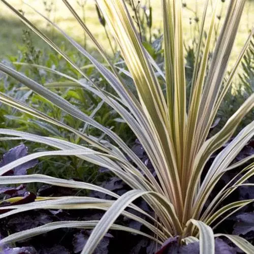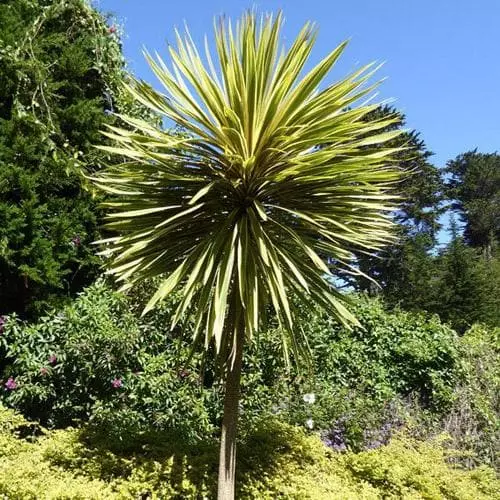 A lovely palm-like shrub or small tree, Cordyline australis Torbay Dazzler lends an exotic note to a garden in a mild, coastal area, and can also be grown in a container.  Long, linear leaves striped green and white and up to 2’/60cm long, gradually die away at the base as the trunk slowly extends, giving the plant its palm-like appearance. Mature plants produce big panicles of white flowers in early summer; container-grown specimens rarely flower, and do not grow so tall. Cordyline Torbay Dazzler is doubtfully hardy, and needs winter protection if frost threatens.