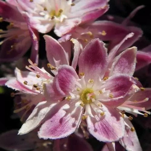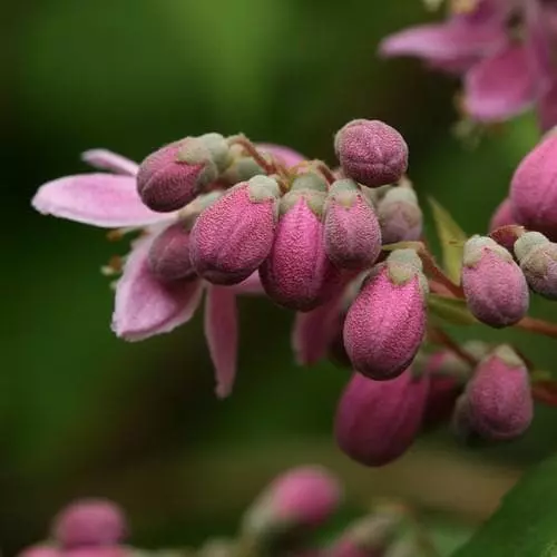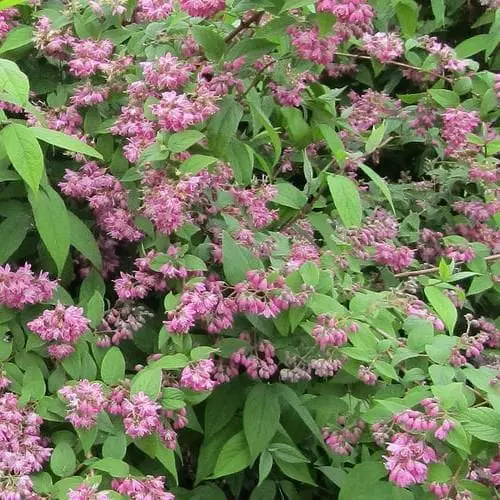 A bushy, medium-sized, flowering deciduous shrub. Deutzia x hybrida Strawberry Field has masses of flowers, crimson outside, pale pink within, opening in early Summer. Deutzias benefit from a regular thinning out of old shoots after flowering.