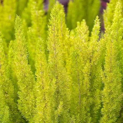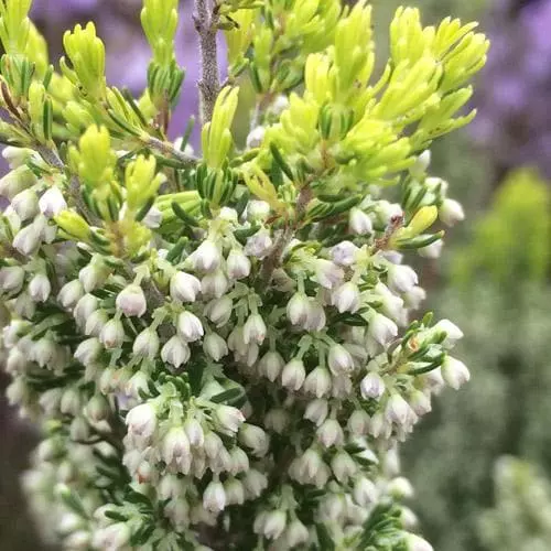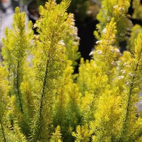 Grown for its brilliant golden foliage, Erica arborea var.alpina f. aureifolia Albert’s Gold is a vigorous, medium-sized, evergreen shrub with a stiffly upright, bushy habit. The small needle-like leaves are bright golden-yellow, lighter when young. Small, round, honey-scented, white flowers in 1’ (30cm) spikes occasionally appear between March and May. Good in containers and in coastal gardens. Clip lightly in spring to keep neat. Tree heath Albert’s Gold holds the RHS Award of Garden Merit.
