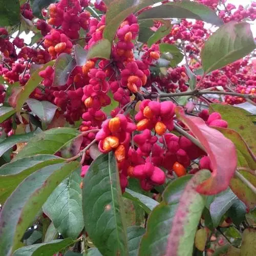 Euonymus europaeus Red Cascade is a spreading variety of our native Spindle Tree commonly seen in hedgerows. Its foliage has plain green leaves, and bright green shoots. The prized Autumnal colouring with reds and scarlets make Red Cascade a popular garden plant. This variety of the Spindle develops arching branches that carry pink fruits with unusual orange seeds during the Winter. A good shrub for the wildlife and woodland garden.