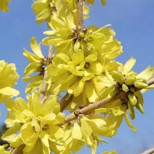 A less common, compact and early flowering Forsythia, large yellow flowers appear on bare stems in March and April. Excellent Autumn colour.