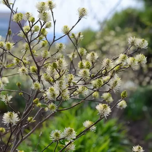 Fothergilla x intermedia Blue Shadow has unusual blue foliage and highly scented flowers. Bottle-brush like, fragrant creamy white flowers appear in Spring. Brilliant autumn colours. An excellent woodland shrub.