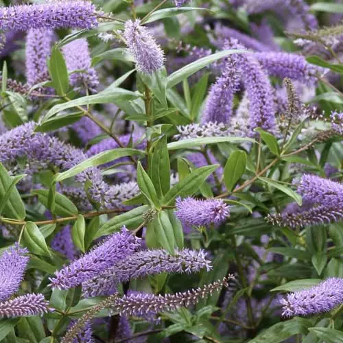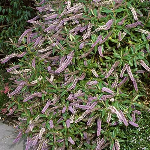 One of the taller shrubby veronicas, Hebe Midsummer Beauty is a medium-sized, upright, evergreen shrub forming a rounded, open mound. The glossy, bright green, elliptical leaves emerge with a purple tinge, and continue to have have purplish undersides. Long spikes of lilac-coloured flowers appear from midsummer to late autumn. An easy, low-maintenance plant requiring minimal pruning. Flourishes near the coast, but may need winter protection in the coldest areas. Hebe Midsummer Beauty holds the RHS Award of Garden Merit.