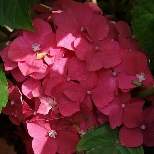 A more compact mophead hydrangea, Hydrangea macrophylla Leuchtfeuer is a medium-sized, deciduous shrub with a broad rounded shape, ideal for the smaller garden. Large, loose, deep rose-pink or purplish blooms appear in early to mid-summer; hydrangea Leuchtfeuer tends towards pink flowers, but flowers will appear more purple on acid soils. The leaves are good, deep green and glossy, and turn to shades of red and yellow in autumn before falling; the leaves come in early in the year. The flowers are good for cutting and drying; leave the flower heads on the plant over winter to protect the flower-buds from frost, and dead-head in February.