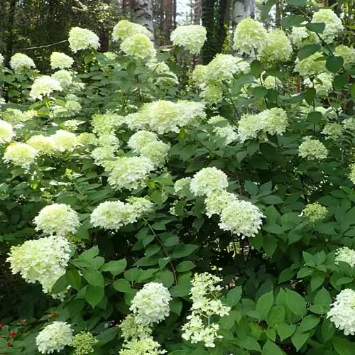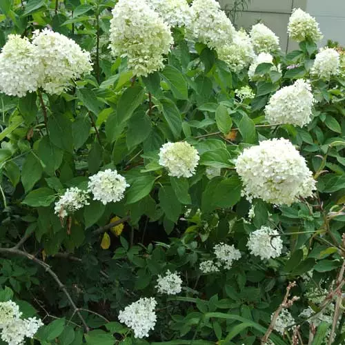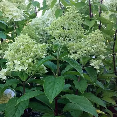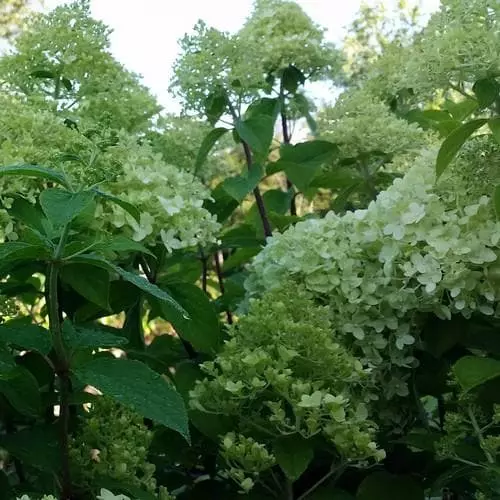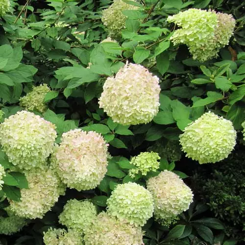 An outstanding cultivar of the panicle hydrangea with a particularly refined flower colour, Hydrangea paniculata Limelight® is a medium-sized to large, vigorous, deciduous shrub with an upright, bushy, spreading habit. The leaves are pale green on grey-green stems, sometimes flushed pink. From mid-summer to autumn the flowers, in magnificent, conical panicles, emerge a delicate pistachio green, fading to ivory; in autumn they turn deep pink. An easy plant, and particularly beautiful in a shady border. Cut back most of the previous year’s growth in early spring to promote flowering. Hydrangea Limelight holds the RHS Award of Garden Merit.