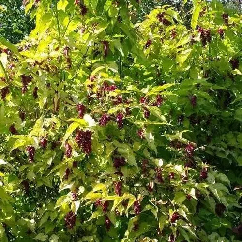 A more compact cultivar of the species, Leycesteria formosa Golden Lanterns is vigorous, medium-sized, deciduous shrub with an upright, bushy habit, grown for its lovely primrose-yellow foliage and long season of interest. The heart-shaped leaves emerge yellow, and fade to a delicate primrose colour – grow in partial shade to prevent scorching of the leaves. In July, August and September, the plant bears 4 inch-long tassels of white flowers with showy, wine-coloured bracts; these are followed by very deep purple berries. Be aware that the plant can become invasive, as birds can spread seed from the berries into walls, paths and other plantings. Also known as Himalayan honeysuckle, pheasant bush Golden Lanterns attracts pollinators, birds and other wild-life, and holds the RHS Award of Garden Merit.