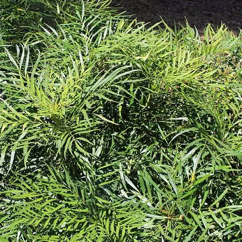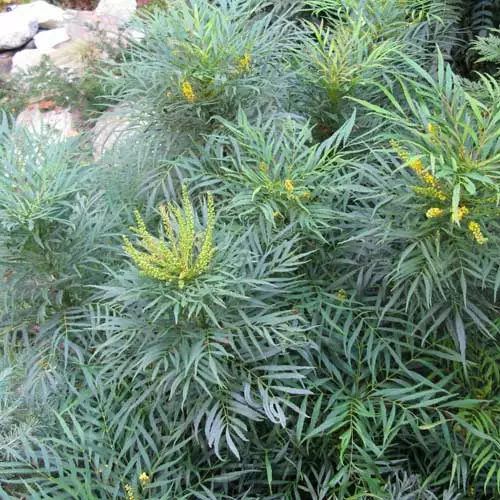 Named for its spine-free leaflets, Mahonia eurybracteata subsp ganpinensis Soft Caress is a medium-sized, evergreen shrub with an upright habit, more compact than other mahonias, and suitable for small gardens and container growing. Unlike the almost holly-like leaflets of other mahonias, the finely cut, long, narrow olive-green leaflets are not prickly, so Mahonia Soft Caress is a good choice for patios where where children play. In autumn abundant spires of citrus-yellow flowers, scented of honey, appear, and last into winter. These are followed by clusters of non-poisonous blue-black berries, which give rise to mahonia’s other common name, Oregon grape. Will tolerate full sun if the soil is reliably moist.