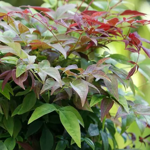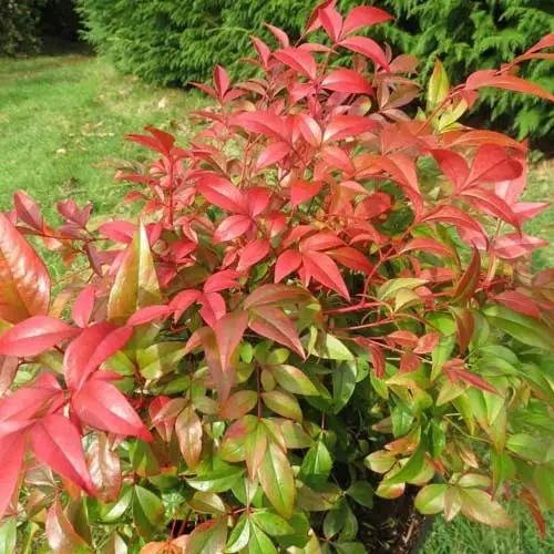 Despite appearances, Nandina domestica Obsessed is not a bamboo, but a member of the Berberis family. Grown for its colourful spring and autumn foliage, Heavenly Bamboo is a small, evergreen shrub with a graceful, upright habit and slender stems. Bamboo-like leaves emerge brilliant red, turning green in summer and a lovely deep red in autumn, the colour persisting into winter. In summer, conical clusters of small white flowers appear, often followed by waxy red berries. These are attractive to birds, but unfortunately are sometimes poisonous to them. It is a compact cultivar of the species grown at the doorways of Japanese houses to provide toothpicks (and dispel bad dreams!) Ideal for growing in a pot in a sheltered patio, it can also be grown in a border.
