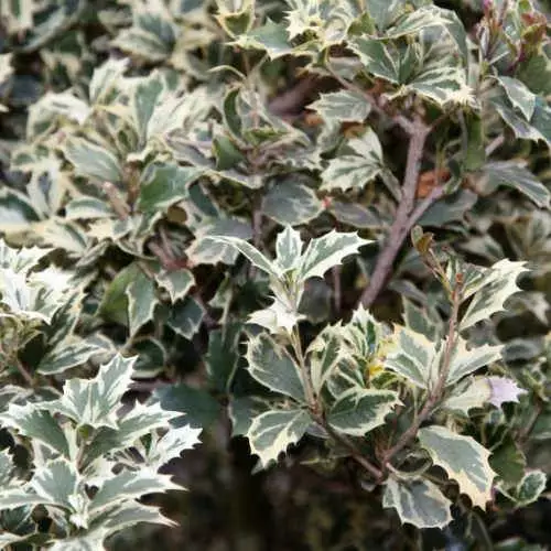 A beautiful, silver-edged, variegated shrub, Osmanthus heterophyllus Variegatus is a medium-sized, slow-growing, evergreen shrub with a neat, pyramidal habit. The spiny, holly-like leaves are glossy green, beautifully edged with silvery-white. In early to mid-autumn small, fragrant white flowers, appear; these are sometimes, but not always, followed by small black berries. Holly olive Variegatus is one of the hardier osmanthuses; it brings a welcome splash of light to woodland plantings or makes a lively hedge.
