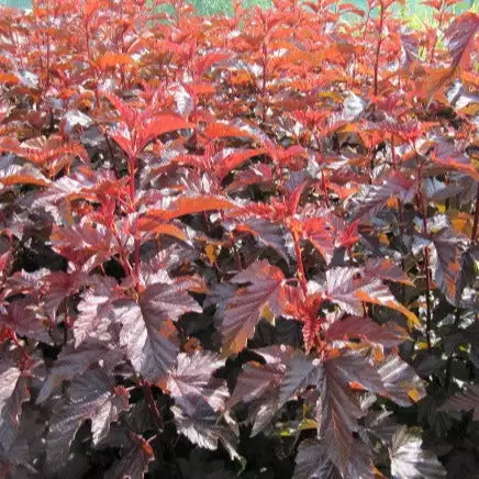 A striking, suckering, deciduous shrub, Physocarpus opulifolius Little Angel has a well-branched, compact, upright, bushy habit and is of average vigour. The rich, ovate, three-lobed leaves emerge orange-red, but mature to a rich burgundy-maroon – very good for adding depth of colour to a mixed bed or border. In June, small, cup-shaped, creamy-white flowers appear, followed by red berries which mature to brown, then black. Cut back up to one in four of the spent (oldest) stems after flowering, and remove suckers. Otherwise, a low-maintenance shrub, untroubled by pests and diseases. Can also be grown in ericaceous compost in a large container.