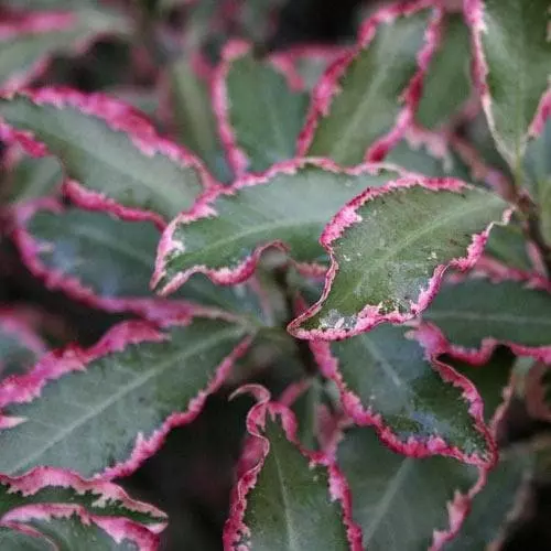 A popular evergreen grey-green leaved shrub growing as a tall broad column. Its leaves have appealing cream/pink tinged margins while small honey-scented deep purple flowers open in clusters in late spring and early summer. Pittosporum tenufolium Elizabeth can also be grown as part of a hedge in coastal locations. It will make an attractive and fairly dense hedge which takes well to clipping. Suitable for any sized garden even in a larger pot once it is regularly trimmed.