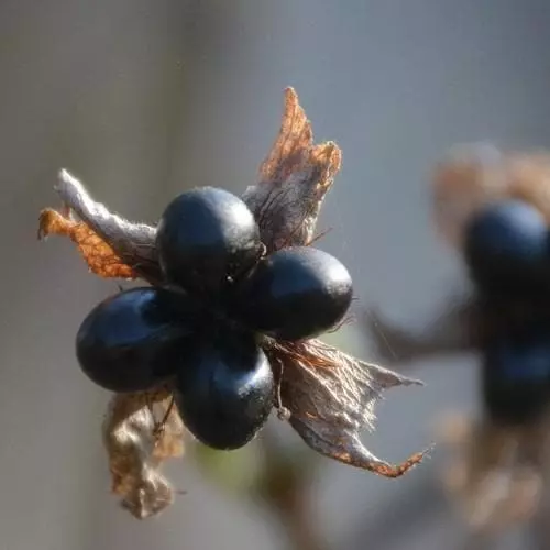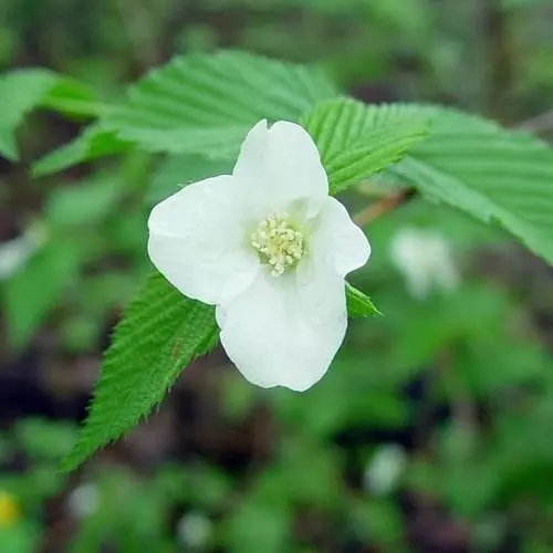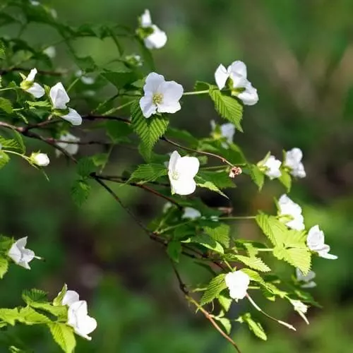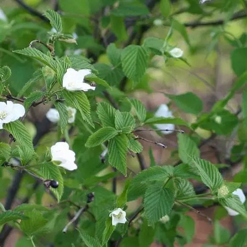 Native to China and Japan, Rhodotypos scandens is a medium-sized deciduous shrub with arching stems and an open, bushy habit, spreading by means of suckers. The long, serrated, deeply veined oval leaves are mid-green with a pointed tip. In late spring and early summer, white flowers appear, rather like single roses, but with four petals; these are attractive to pollinators. They are followed by shiny black berries; be aware that these are toxic, although some birds seem able to eat them. Jet bead is good in a woodland garden, but is also tolerant of urban pollution.