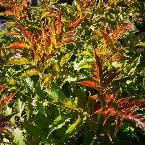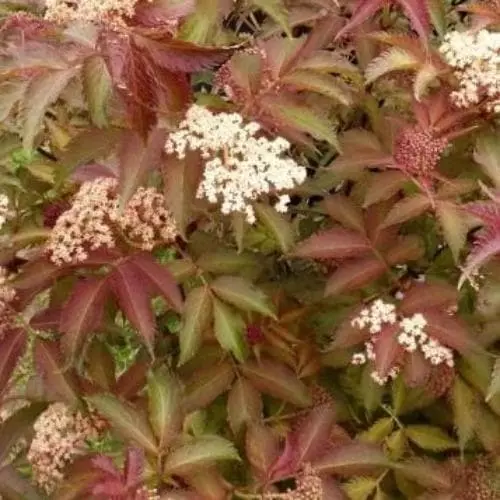 A new, brilliantly coloured dwarf elder cultivar, Sambucus nigra Serenade is a medium-sized, deciduous shrub, with an erect, well-branched habit, a good specimen for the small garden and with three seasons of interest. The leaves are heavily dissected, rather like a Japanese maple’s, and emerge pinkish-red, turning through bronze to a bright lime-green, before turning red again in the autumn. Large, flat heads of honey-scented, creamy flowers appear in June and July, followed by juicy black berries which attract birds – and home wine-makers! Dwarf elder Serenade is easy to grow, but benefits from a generous mulch of well-rotted garden compost or manure (not touching the stems) in early spring.