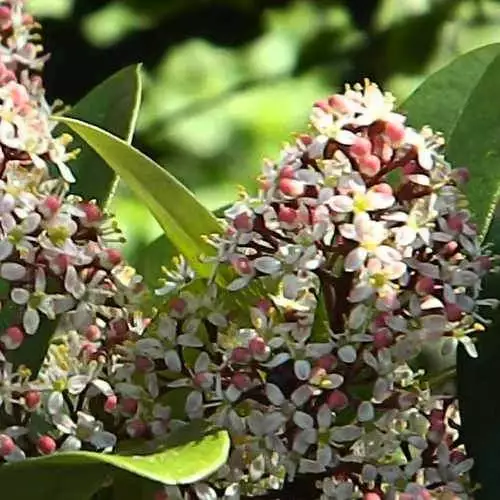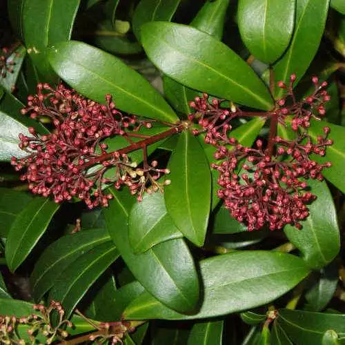 A really easy, reliable shrub for winter colour in a shady spot on slightly acid soil, Skimmia japonica Rubinetta is a small, slow-growing, evergreen shrub with a dense, mounded habit. The foliage is deep green and leathery, making the plant drought-resistant once established. All through winter, the bush carries red buds, which open in spring to heads of scented, white flowers, tinged pink; these light up the shade and are highly attractive to pollinators. Despite the rather feminine name, Japanese skimmia Rubinetta is a male form, and will not bear berries.