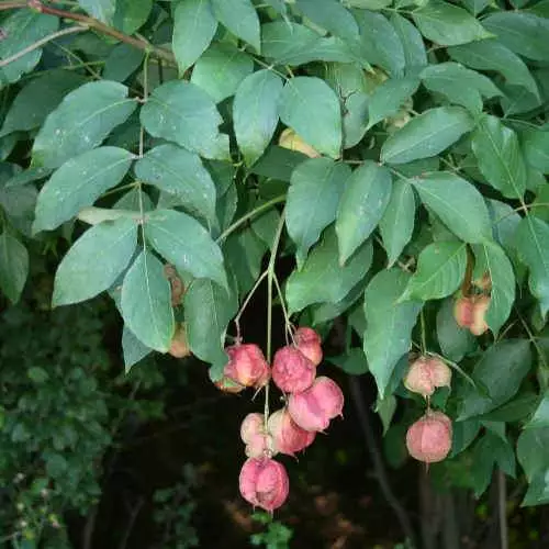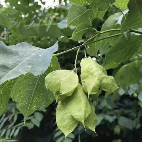 Grown for its flowers and curious, bladder-like fruit, Staphylea pinnata is a large, vigorous, deciduous shrub with sturdy shoots and an upright, spreading habit. The dark green leaves are divided into 5-7 oval leaflets. In late spring and early summer, long, hanging racemes of lightly scented, bell-shaped white flowers tinged with pink emerge from pink buds.These are followed by inflated, pale green, lobed fruit, the bladder nuts of the name. Common bladdernut is an easy, low maintenance, trouble-free shrub.