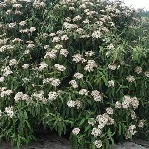 A graceful, architectural plant giving year-round interest, Viburnum rhyditophyllum Willowood is a large, fast-growing, evergreen shrub with a neat, bushy habit. The glossy, oblong, strongly veined leaves emerge covered with greyish felt but turn deep green above and pale and silvery-grey underneath. In June and July pure white, lacecap heads of tiny flowers emerge from silvery buds, standing out against the leaves; black berries sometimes follow. Leatherleaf viburnum Willowood is good, structural plant for any style of garden, and a great foil for showier perennials. Can also be grown as an informal hedge.