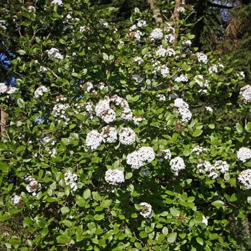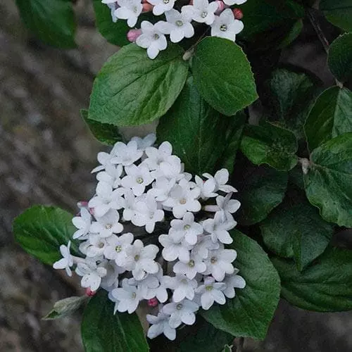 Grown for its lovely scent, Viburnum x burkwoodii Anne Russell is a medium-sized semi-evergreen to deciduous shrub with a neat, compact, rounded habit; it will remain evergreen in warm, sheltered gardens in the mildest areas, but will lose its leaves in winter elsewhere. The elliptical leaves are mid-green and glossy, sometimes turning red or purple in autumn. In spring, rounded heads of richly fragrant, tubular white flowers emerge from pink buds which stand through winter. Viburnum Anne Russell can be grown as a low hedge, as it responds well to clipping; it can also be trained as a standard.