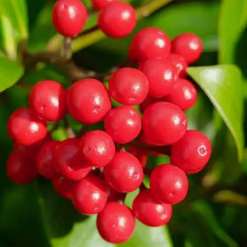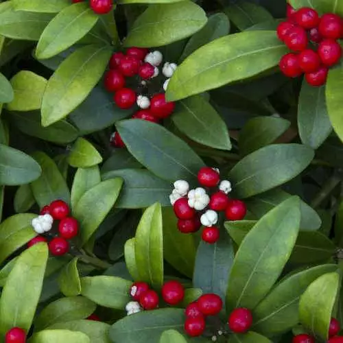 Unusually for a skimmia, Skimmia japonica subsp. reevesiana is hermaphrodite, and will bear berries without another skimmia nearby; it will also tolerate slightly alkaline soil. It’s a small, slow-growing, evergreen shrub with a dense, mounded habit. The aromatic leaves are narrow, deep green and leathery, making the plant drought-resistant once established. In mid- to late spring, panicles of scented, creamy-white flowers open from red buds; these are a valuable nectar source for pollinators. In autumn, the flowers are followed by bright red berries, which often persist until the following spring – the birds leave them alone! Hermaphrodite Japanese skimmia is a really easy, low-maintenance shrub for almost year-round colour in a shady spot in even the smallest garden.