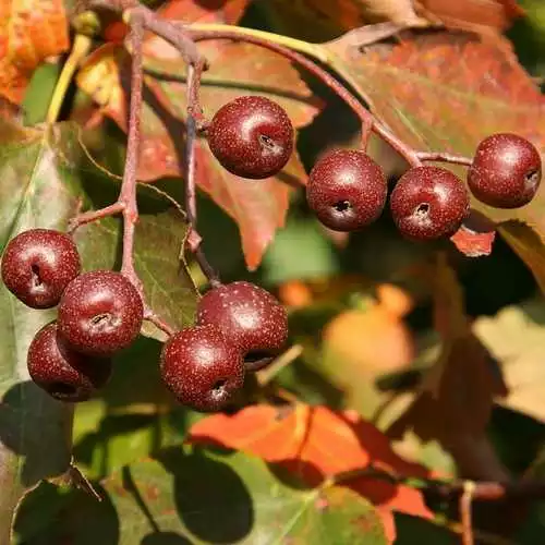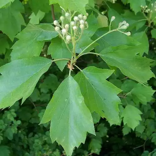 Wild service tree is a deciduous broadleaf tree native to the UK and parts of Europe, Africa and Asia. It is a large growing tree with a spreading habit and broad crown, it also works well as part of a fruiting hedge. The grey bark distinctively cracks into plates, revealing darker bark underneath. Sorbus torminalis has attractive, lobed green leaves turn red and brown in autumn. Cream-coloured flowers in early summer are followed in autumn by small, oval, brown fruits with paler spots, about ½”/10-15mm across, edible when ‘bletted’ (softened by frost); the taste is reminiscent of dates, and the fruits can also be used for making wine or flavouring whiskey.