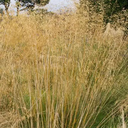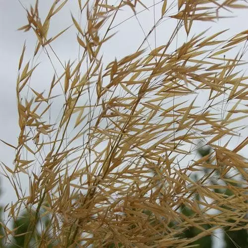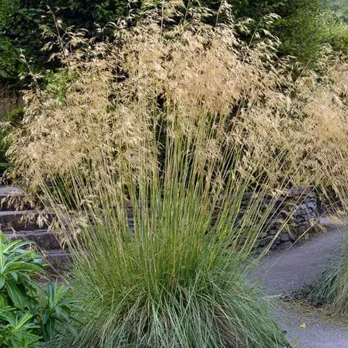 Stipa gigantea is tall, striking, ornamental grass suitable for dry sunny locations. Green narrow leaves forming a mound to about 50 cm. or more. In Summer tall stems rise up to 2.5 m. carrying the beautiful dangling sprays of golden flowers.