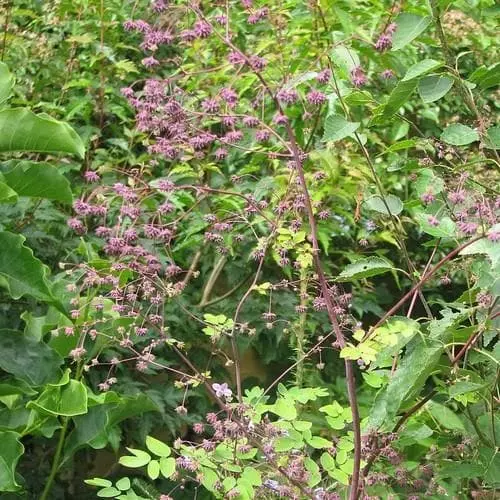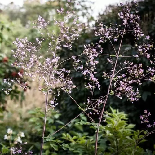 Favoured for its lacy refined purple tinged delicate fern like foliage and sturdy purple stems. Thalictrum rochebrunianum begins flowering a bit later than other Meadow Rues, from mid Summer onwards. Starting with pearl like buds, in abundance, opening into a graceful cloud of tiny lavender flowers with exquisite fluffy yellow centres. The flowers are extremely attractive to butterflies and other pollinators making it perfect for the wildlife garden. Very interesting cut flowers. Generally resistant to grazing deer and rabbits. Meadow Rue prefers moist humus rich soil in dappled shade. They are perfect for naturalising in a woodland or shrubby border. Due to its size and bushy habit, Thalictrum rochebrunianum makes an excellent gap filler and also an impressive stand alone specimen.