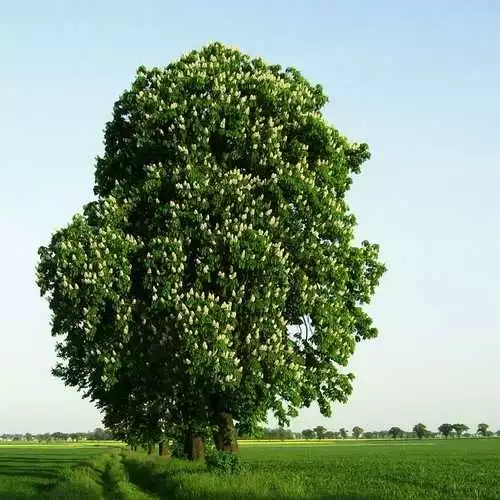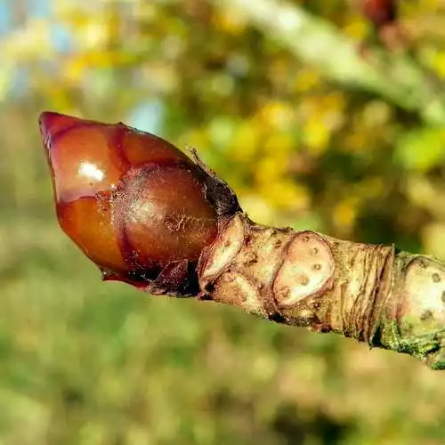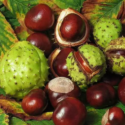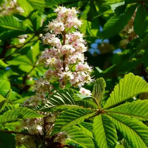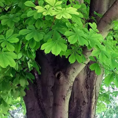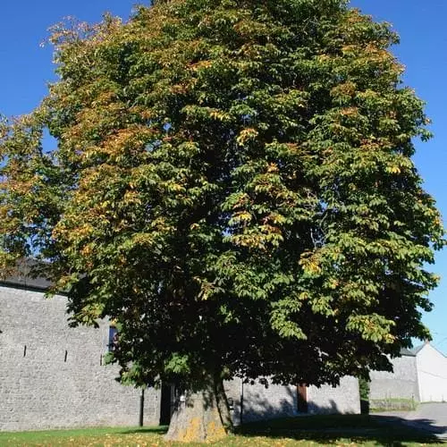 Originally from the Balkans but long naturalised in Ireland, the familiar Horse Chestnut – Aesculus hippocastanum – is a large, deciduous tree, with a broad, domed, spreading crown and imposing habit. The branches are slightly pendulous, turning up at the tips. The big, sticky buds are very prominent in winter. In May, the tree is covered with showy ‘candles’ of creamy white flowers with a yellow spot which turns pinkish-red with age; these are a valuable nectar-source for bees. These are followed in early autumn by big, spiky fruit which split to expose the familiar, shiny-brown ‘conker’. The leaves, which appear early in April, are large and green, divided into 5-7 leaflets; they turn reddish brown in autumn. The Horse Chestnut makes a handsome specimen tree for a park or large garden, and is of interest at all times of year.