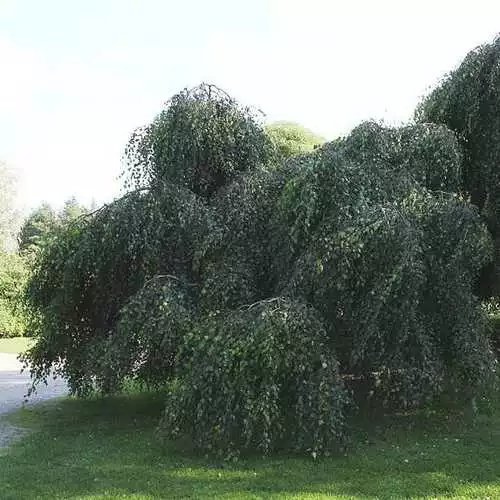 A weeping cultivar of the native silver birch, Betula pendula Youngii is a better choice than Tristis for the smaller garden. Young’s weeping birch is a small, slow-growing, deciduous tree with a domed crown and arching, slender branches which fall right to the ground. The bark is white and peeling; dark fissures develop as the tree ages. Rarely flowers and fruits. The leaves are small, delicate and heart-shaped, a fresh, light green, turning yellow in autumn. Good specimen for the small garden, making a lovely ‘den’ for children to play in.