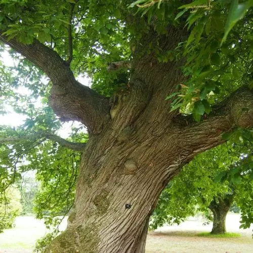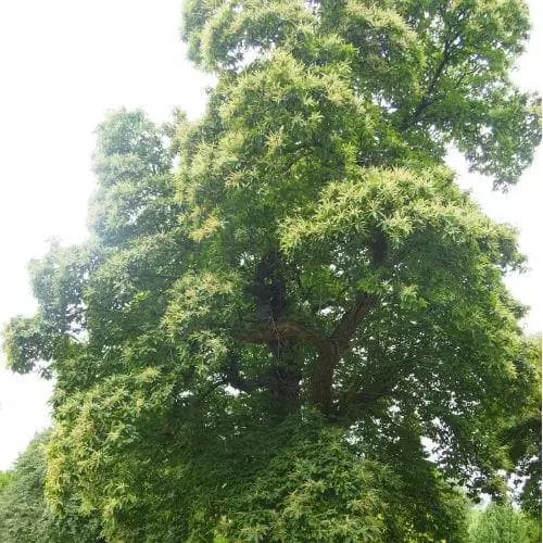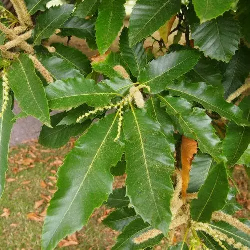 Long established in Ireland, the Sweet or Spanish chestnut, Castanea sativa, is a large, fast-growing deciduous tree with a broad-headed habit and distinctive, spiral grooves in the bark as the tree matures. Can reach 30-35m in height. Long, handsome, toothed leaves up to 20cm/8” long, turning yellow in autumn. Yellowish male catkins 15cm/6” long; the female flowers at the base of the catkins are followed by the spiky, pale green fruit which splits to reveal a pair of the familiar edible chestnuts. Unlikely to fruit regularly. Thrives on moist, acid to neutral, sandy loam, but tolerates a wide range of reasonably deep soils. Can be coppiced – the durable, rot-resistant wood is ideal for fencing and loved by many green woodworkers.