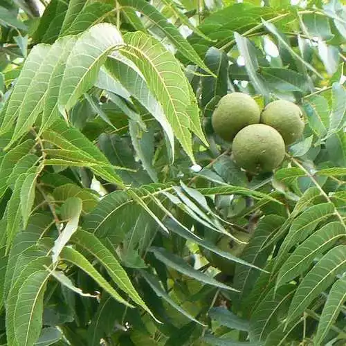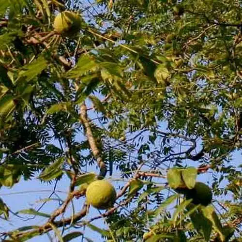 Native to Eastern and central north America, and introduced to Europe in the 1650’s, Juglans nigra is among the top timber growing trees suitable for the Irish climate, praised by all sorts of craft people for its excellent durability and attractive dark timber. As a tree it grows into a large spreading tree, with a beautiful rounded canopy, bearing golfball-sized fruit with bright green husks, which decay to reveal the shell, which contains within, the edible ‘meat’. Good choice for larger gardens, equally good in an Agro-forestry plantation. Black walnut is also allelopathic, which means that it releases chemicals from roots and other tissues that give the tree a competitive advantage. Will only fruit well after a good Summer, so not a reliable nut producer in Ireland, but a beautiful tree.