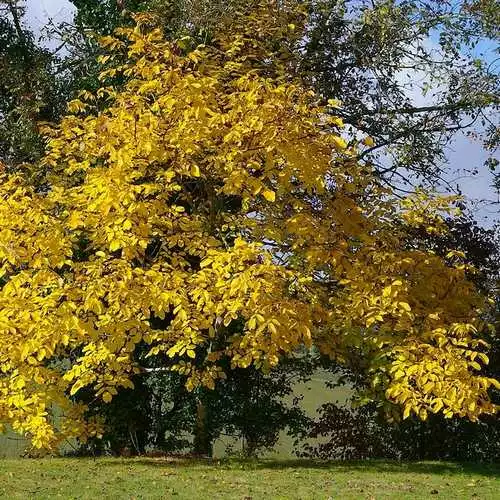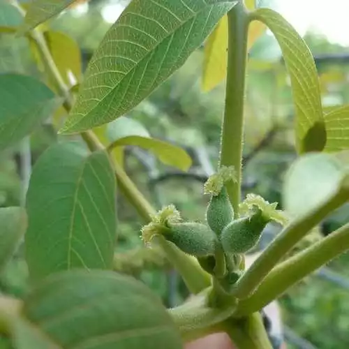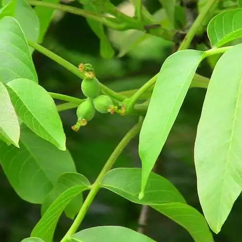 The source of the familiar walnut, Juglans regia is a large, slow-growing deciduous tree with a short trunk and a broad, spreading crown. The large, green leaves, divided into 5-7 oblong leaflets, and with a citrus scent when crushed, appear quite late in spring, and do not fall until November. The flowers appear at the same time as the leaves; the male catkins are about 4”/10cm long and the female flowers much smaller, and wind-pollinated. Velvety green, round fruits appear in June, within which form the nutritious nuts, high in protein, omega 3 oil and antioxidants. Be aware that the common walnut casts a heavy shade and also produces a substance that inhibits the growth of many other plants. Not a reliable nut producer in Ireland, but a beautiful tree.