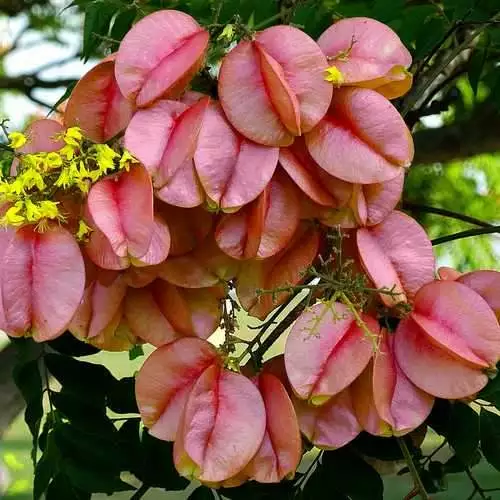 Also known as Chinese golden rain tree, Koelreuteria bipinnata is a medium-sized, elegant, deciduous tree with a broad, spreading crown. Long panicles of yellow flowers appear in spring, followed by quirky reddish-bronze, bladder-like, lantern-shaped fruits. The leaves which can grow up to 60cm long emerge pink, turning bright green in summer and brilliant shades of yellow and orange in autumn. It thrives on dry chalky soils, and tolerates urban pollution.