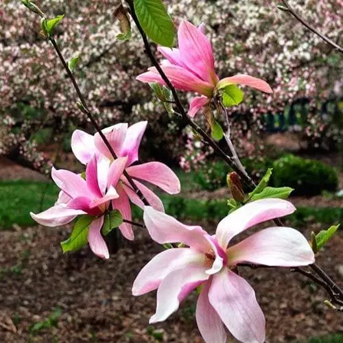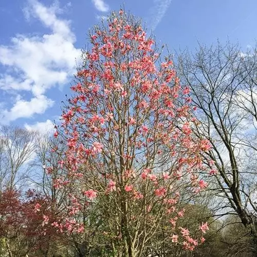 A comparatively late-flowering magnolia, and notably hardy, Magnolia Daybreak is a good choice for colder areas. It’s a medium-sized to tall, deciduous tree of medium growth-rate with a very upright, almost columnar habit when young, spreading somewhat as it matures. The elliptical leaves are mid-green. The large, cup-shaped flowers, whose splayed petals display shades from carmine to rose-pink to shell-pink, emerge on the bare branches, and are strongly scented, with a rather fruity fragrance. It’s an easy, adaptable magnolia; if any pruning is needed, it should be done in midsummer. Magnolia Daybreak holds the RHS Award of Garden Merit, and is an excellent choice as a specimen, drawing all eyes when in flower.