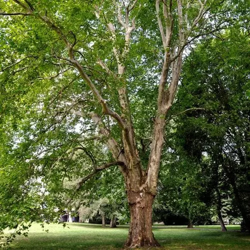 A vigorous, upright deciduous tree with distinctively flaking, brown, grey and cream bark resembling army camouflage, Platanus acerifolia has bright green lobed leaves and bears curious clusters of persistent round fruits in autumn and winter. Its true origins were long debated, though it is now agreed it is a natural hybrid between Platanus orientalis and Platanus occidentalis. The London Plane received its common name when it was by far the most popular tree planted in the City of London in the 1800s, because of its tolerance of atmospheric pollution and root compaction. Many of these Plane trees are still thriving and are kept to a reasonable size by pollarding them regularly.