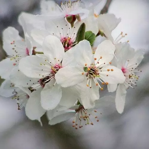 A dwarf hybrid of the Fuji cherry bred by the Irish horticulturist Keith Lamb, Prunus x incisa Woodfield Cluster is a medium-sized deciduous shrub with a delicate, spreading habit and a fantastic display of spring blossom, ideal for a small or Japanese garden. The long, serrated leaves emerge pale green, turning deeper green in summer and shades of red and orange in autumn. The white flowers with a tinge of pink at the centre are small but wonderfully profuse, and appear in March, just before the leaves; the blossom is very attractive to pollinators. Fuji cherry Woodfield Cluster is very easy to grow, requires little pruning, and looks lovely underplanted with small spring bulbs, or in a large container.