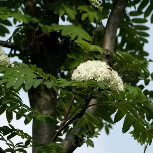 A cultivar of the native Irish rowan or mountain ash, Sorbus aucuparia ‘Sheerwater Seedling’ is a vigorous, medium-sized to tall tree of upright, narrow habit, the crown widening with maturity. It is often planted as a street tree. Creamy-white flowers appear in April–May, reliably followed by large clusters of long-lasting red berries in late summer. The leaves are grey-green, turning yellow and gold in autumn. A very easy, fast-growing, reliable tree, good for  pollinators and birds. Plant in full sun for the best shape. Holds the RHS Award of Garden Merit.