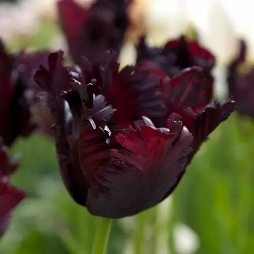 A stunning, May-flowering tulip, Tulipa Black Parrot is a fairly tall, deciduous, bulbous perennial with an upright habit. The green leaves are quite broad, disappearing in summer as the bulb goes dormant, but it’s wise to plant a late perennial in front to conceal the dying leaves. In May, the purple-black, cupped flowers emerge from green buds with the characteristic twisted, feathered petals of parrot tulips, and sometimes have a green streak down the centre of the petals. It’s particularly good with late-flowering peach and orange tulips. Plant in November, close together to prevent any tendency to flop. It is quite a good perennial tulip if planted 8”/20cm deep – it’s come up in my sandy soil for several years.