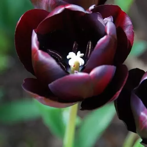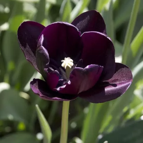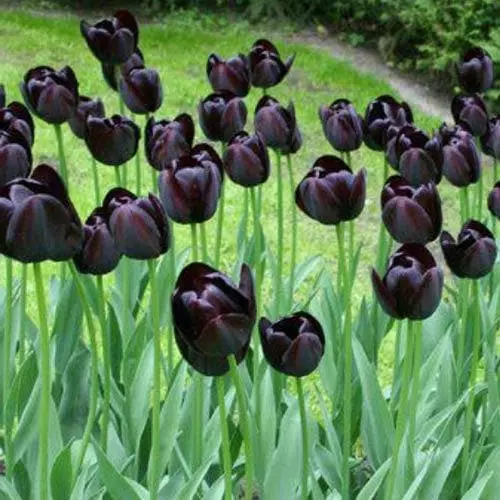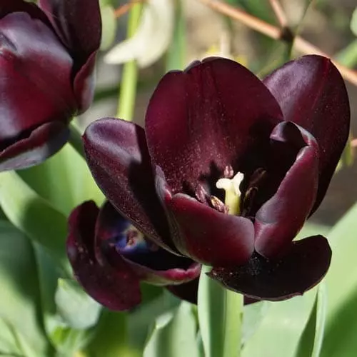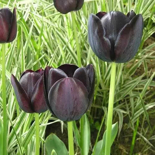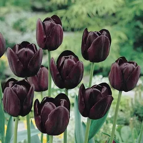 The classic black tulip, Tulip Queen of Night, when illuminated by sunlight, glows deepest burgundy or maroon. The satiny dark flowers deserve to be seen in generous clumps against a pale background or contrasted with lighter harmonies of pale lavender or white blossoms. Reaching a flowering height of 50 cms or more, Tulip ‘Queen of Night’ is a stalwart of the Spring garden, reappearing year after year in the month of April.