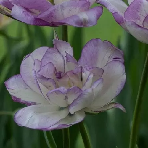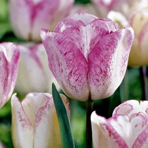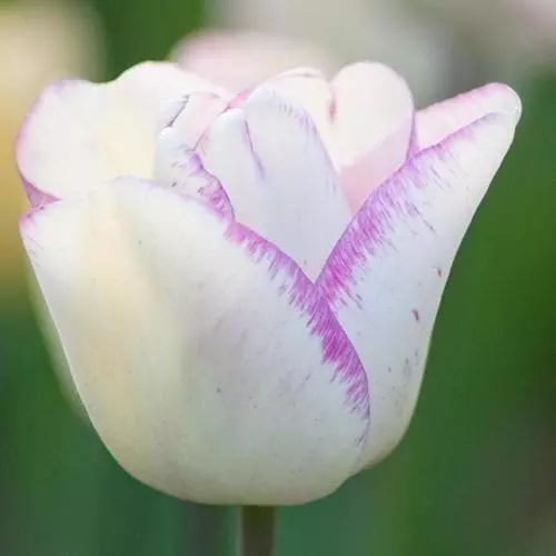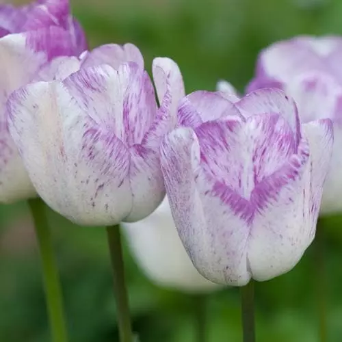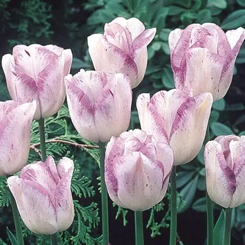 Single ivory-white flowers with narrow purple margins and spotted pale purple at the base, these coloured markings increase with age. Tulip Shirley makes a very attractive and feminine display. Beautiful planted with contrasting silver foliage.