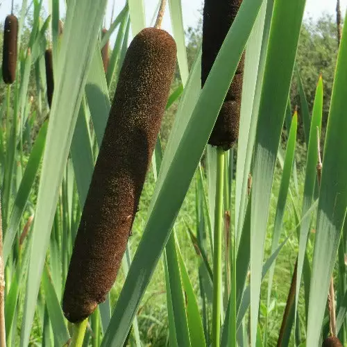 A native rush, also known, strangely, as asparagus of the Cossacks, Typha latifolia is a tall, robust, rhizomatous, deciduous perennial, which can spread a lot; it has an upright habit. It has long, strap-shaped, green leaves. In summer, great reedmace bears tall, cylindrical, brown bulrush-type flower-spike – it is often called bulrush. This plant tolerates exposure. Divide the rhizomes in spring to establish new colonies. Otherwise, an easy plant, pest- and disease-free, but be warned – it will spread and is only for very large ponds and lakes.