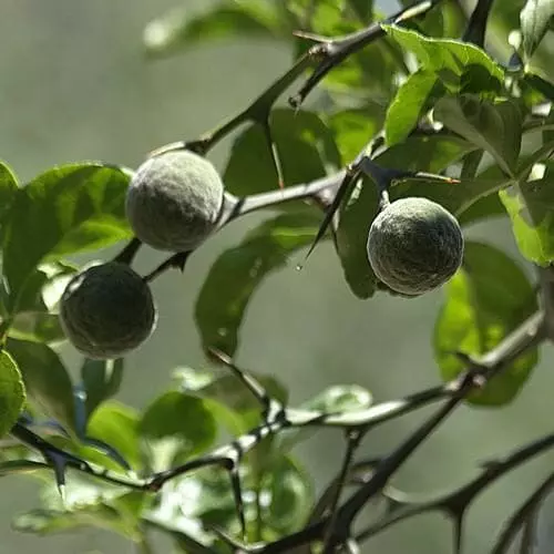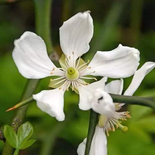 Quite rare as a garden shrub, Poncirus trifoliata is deciduous with distinct leaves on green stems with long thorns, but its main draw is it fantastically scented flowers in late spring followed by orange/green coloured mandarin sized fruit which have an attractive downy coating and hang on the tree well into Winter. Due to its thorns, it has been utilized as a stock-proof hedge, even known to keep back the must brutish of grazers, while also providing an interesting food source for humans (marmalade!) and wildlife alike.