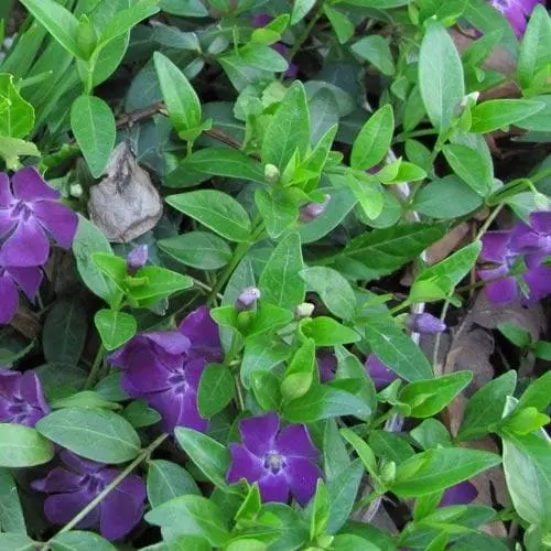 Ideal for shady corners, banks or slopes, Vinca minor Atropurpurea is a low, mat-forming, evergreen perennial with long, spreading shoots, rooting as they go. The slightly pointed, ovate leaves are a deep, matt green. Pretty, single, deep plum-purple flowers bloom from April to September. Purple lesser periwinkle is a very easy, adaptable plant which will grow virtually anywhere, though flowering best in full sun. It spreads to form weed-suppressing ground-cover, but is not as invasive as greater periwinkle; cut back any unwanted shoots in spring.